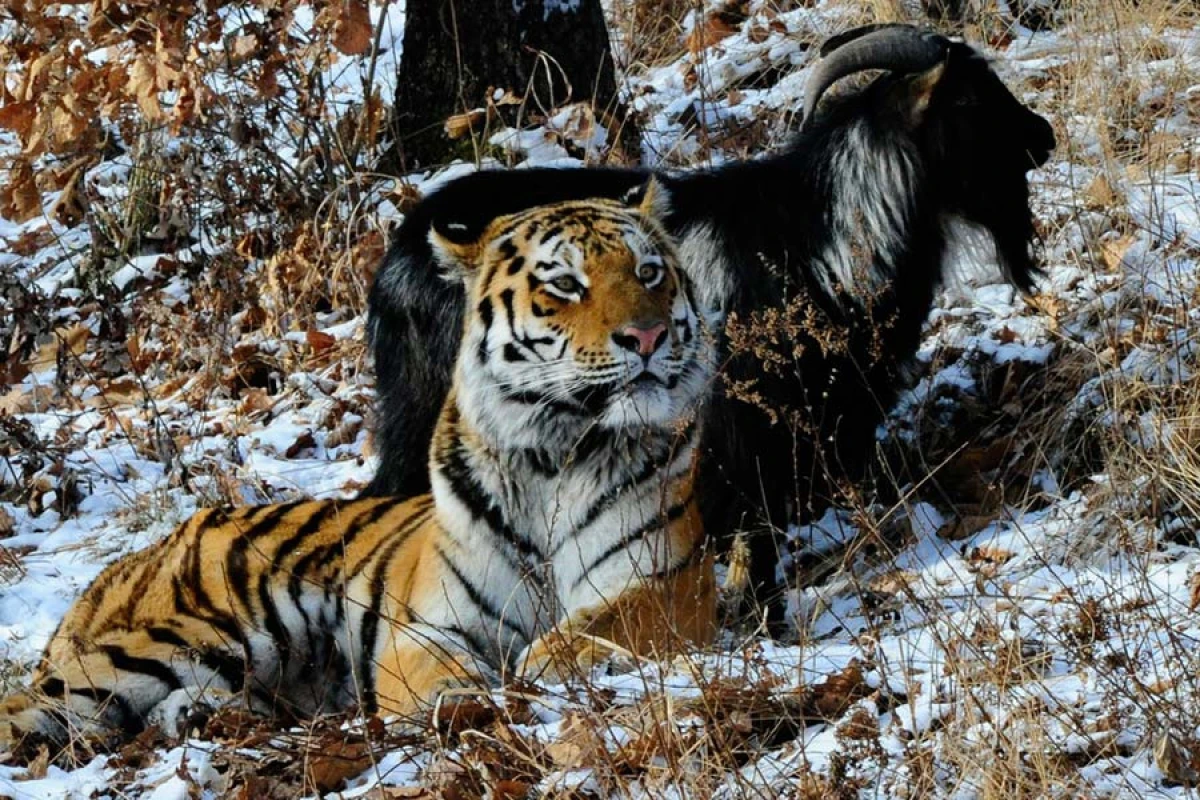 Необычная история произошла в Приморском сафари-парке, где вот уже несколько дней тигр по кличке Амур соседствует в вольере с козлом.