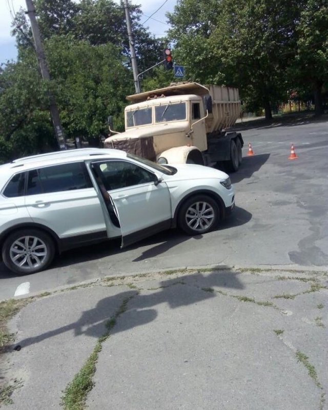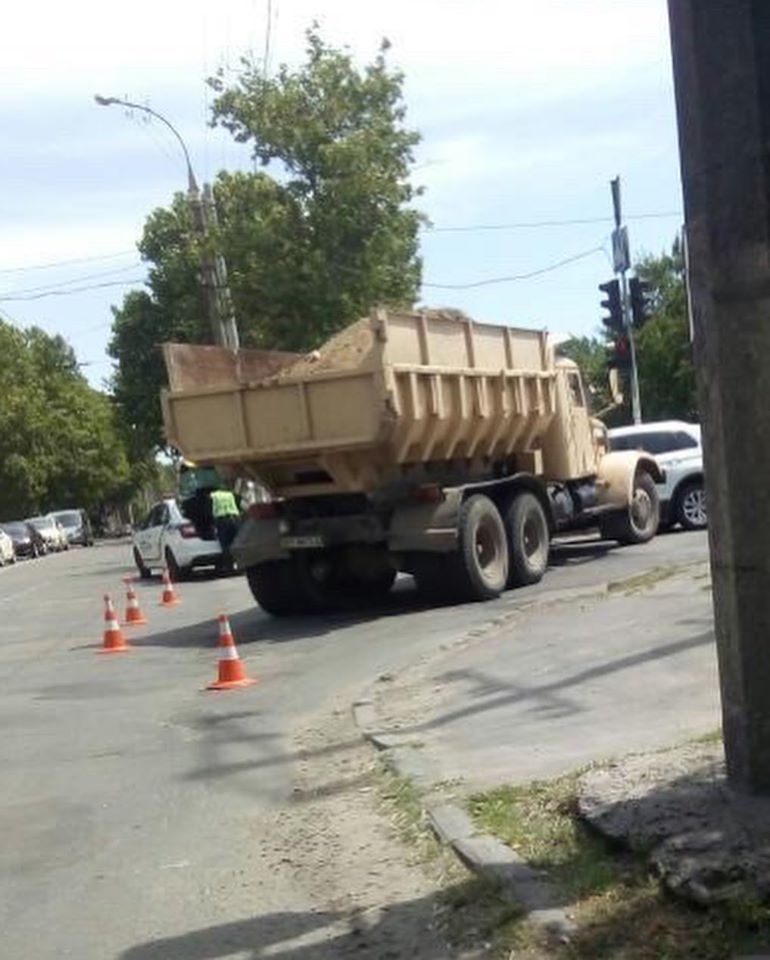 ДТП случилось на улице Ладычука. Сильных повреждений машин не видно. На месте работает полиция. Проезд на боковую улицу полностью перегорожен самосвалом и дородными фишками.