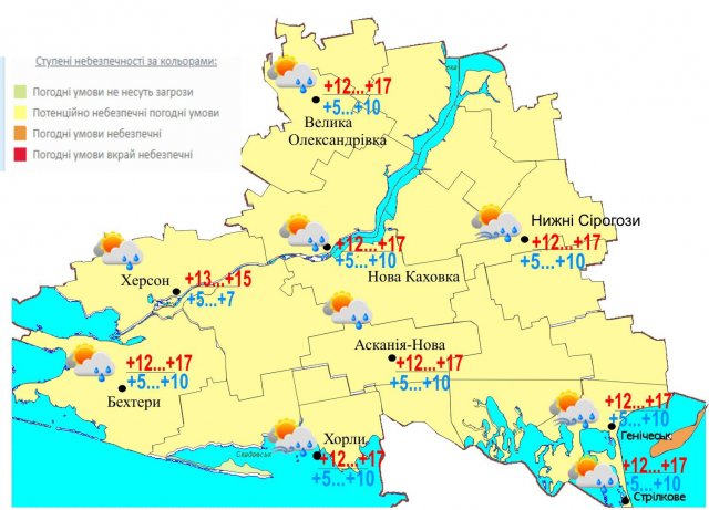 По городу Херсону: Ночью и утром туман (І уровень опасности-желтый).