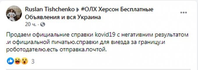 На досках объявлений, в интернете и социальных сетях Херсонского сегмента, полным ходом идет торговля справками с негативным результатом на СО\/Ю -19.