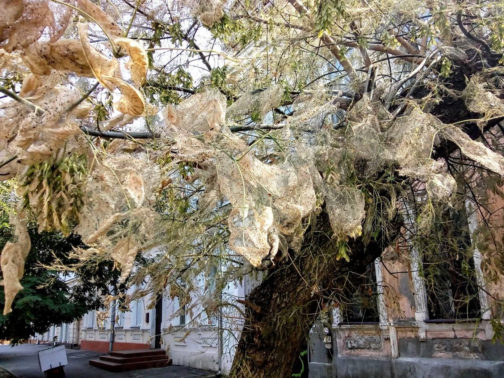 Впрочем, от нее страдает не только растительность, но и люди, поскольку противная гусеница лезет в дома и хозяйственные постройки. Особенно от этого страдают отдыхающие в старых деревянных домиках без противомоскитных сеток на окнах и дверях: проникшие туда через щели листоеды бесцеремонно лазают по стенам, в шкафах с продуктами, и даже по кровати. И все из-за того, что владельцы зеленых насаждений вовремя их не обработали инсектицидами от прожорливого вредителя, оставляющего по себе голые деревья, обтянутые паутиной коконов.