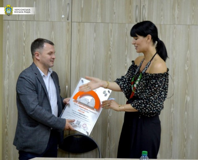 В конце встречи Почетный Посол вручила и. о. заместителя мэр табличку "Херсон — город свободен от насилия".