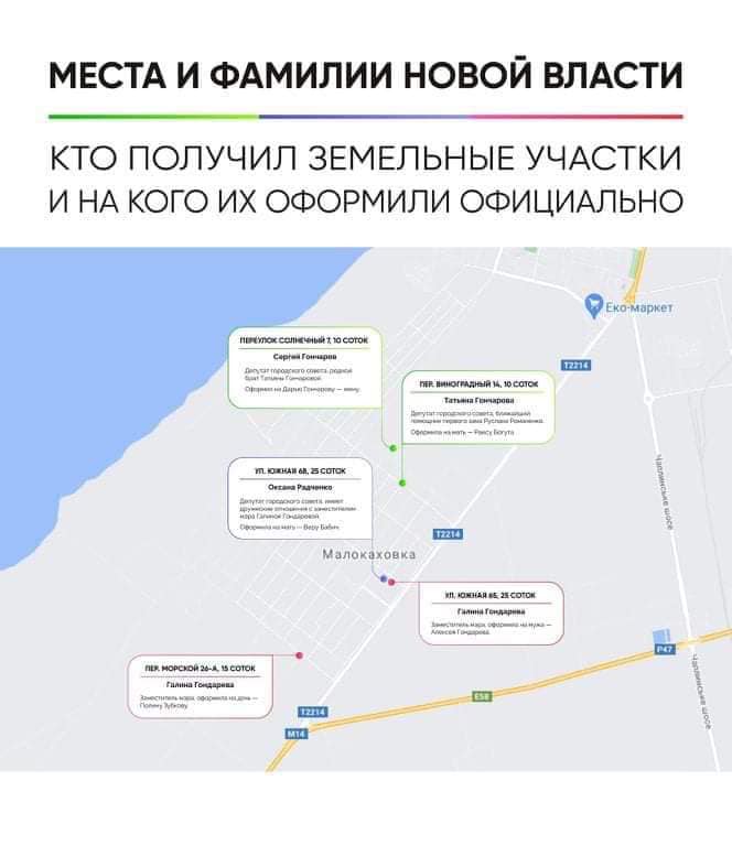 «Несмотря на вопиющую несправедливость, мэр Каховки Виталий Немерец ничего не имеет против. Не прошлой сессии депутаты окончательно проголосовали о бесплатном предоставлении земельных участков родственникам местных депутатов и чиновникам, а мэр подписал эти решения», — сообщает Салтыков.