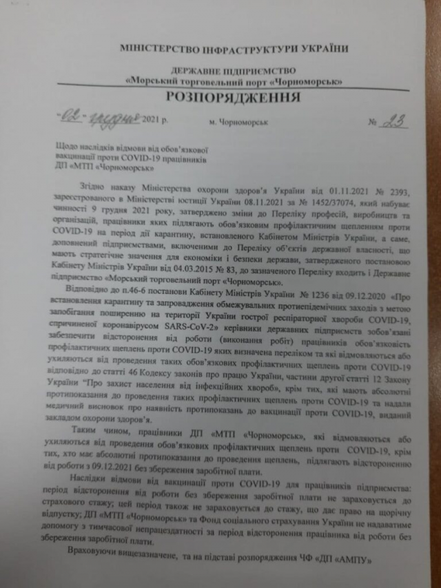 МОЗ предупреждало, что, если по состоянию на 9 декабря сотрудники не будут иметь сертификат о прививке хотя бы одной дозой вакцины, справку о выздоровлении или о противопоказаниях к вакцинации, то их отстранят от работы без сохранения зарплаты.