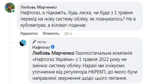 "Газоснабжающая компания "Нафтогаз Украины" с 1 мая 2022 года не меняет систему учета. Сейчас мы ожидаем уточнения от регулятора НКРЭКУ, к которому были направлены обращения по этому вопросу", - ответили в Нафтогазе.