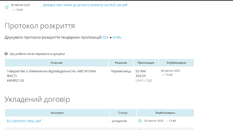 Про це повідомив Центр публічних розслідувань з посиланням на систему закупівель Prozorro.