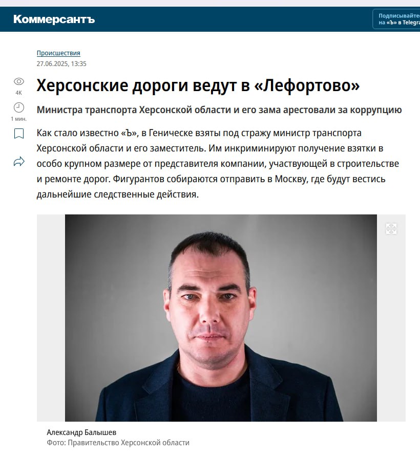 “За клопотанням слідчих СКР Генічеський районний суд Херсонської області заарештував на два місяці міністра транспорту та розвитку транспортної інфраструктури регіону Олександра Балишева та його заступника – начальника управління дорожнього господарства Сергія Журавльова. Їм інкримінується отримання хабаря в особливо великому розмірі. Передбачається, що вже найближчим часом фігурантів відправлять до Москви, оскільки їхнє кримінальне переслідування здійснюють слідчі центрального апарату – ДСУ СКР”, – зазначають росіяни.