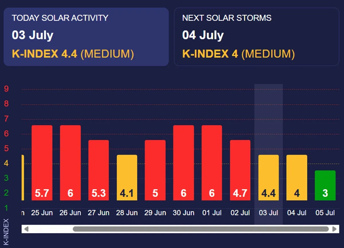 Отож, 3 липня 2025 року на Землі спостерігатиметься геомагнітна буря середнього рівня з К-індексом 4,4, що відповідає перехідному "жовто-червоному" рівню активності. Це свідчить про суттєву збудженість магнітосфери Землі, а отже більшість людей будуть скаржитись на підвищений артеріальний тиск, мігрені, запаморочення та зниження працездатності.