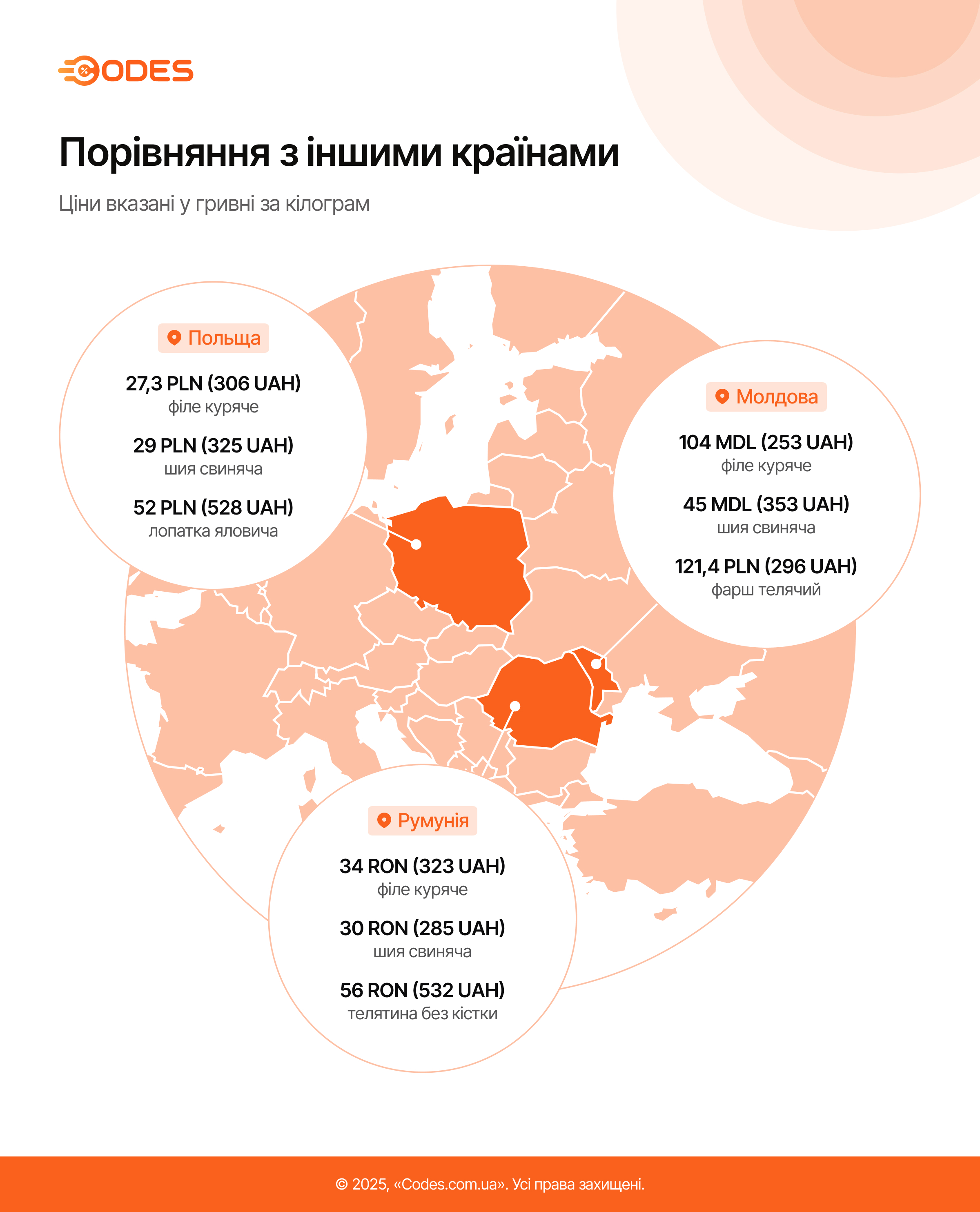 Вартість курячого філе у Польщі — 306 грн, у Молдові — 253 грн, а в Румунії — 323 грн. Ціни на свинину також не сильно відрізняються від українських. За 1 кг ошийка у Польщі треба віддати 325 грн, у Румунії — 285 грн, а в Молдові — 353 грн. А ось за яловичину в сусідніх країнах доведеться заплатити значно більше, ніж в Україні. В Румунії телятина коштує 532 грн, а у Польщі — 582 грн.