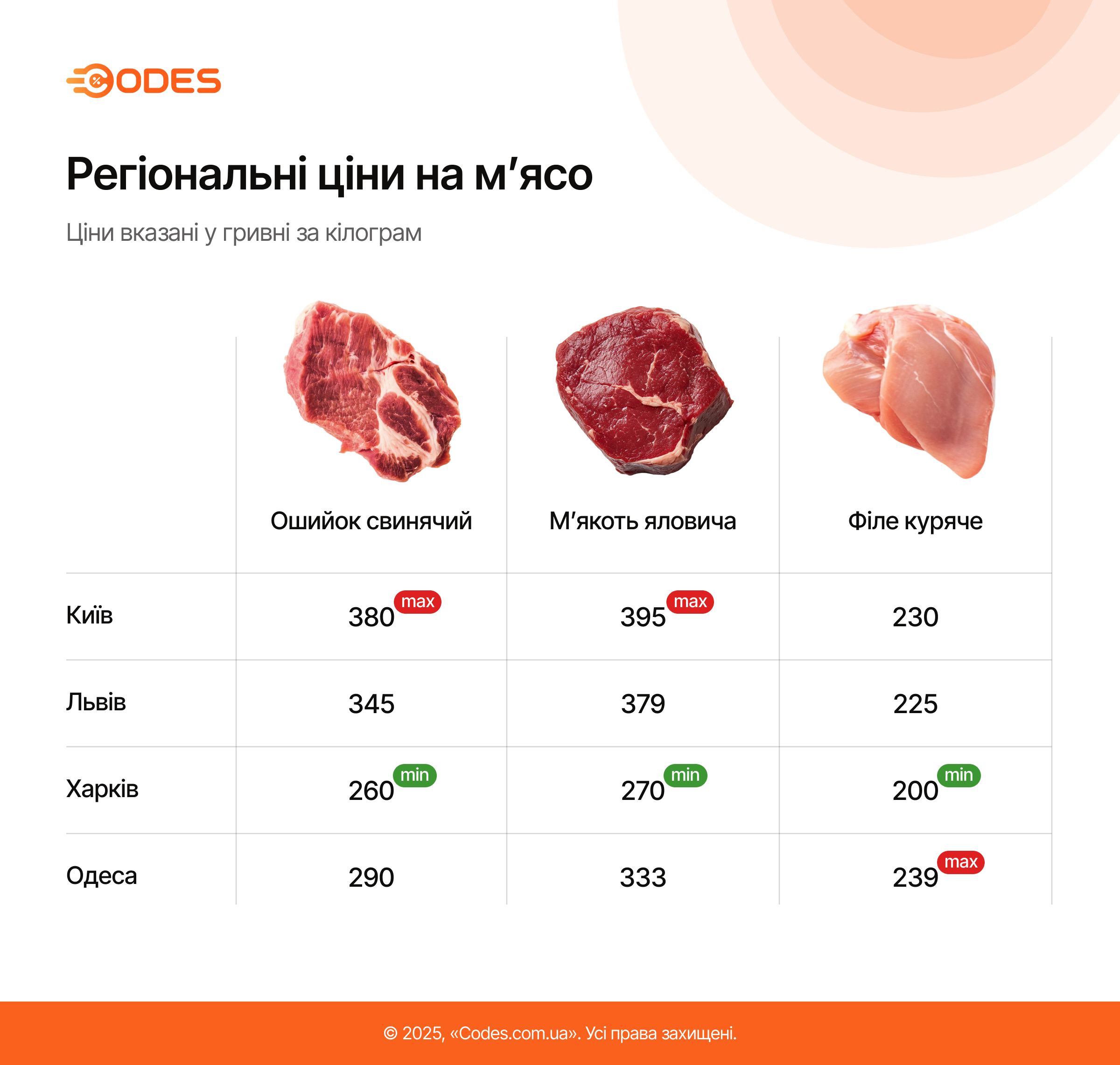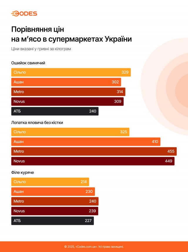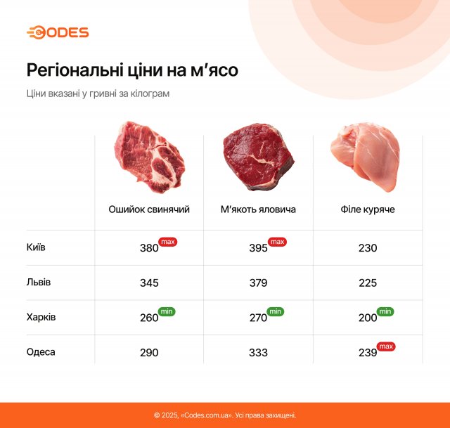 Редакція Codes.com.ua встановила, що найдешевше м'ясо можна придбати в Харкові. За кілограм курячого філе в місцевих магазинах там доведеться віддати 200 грн, свинини — 260 грн, яловичини — 270 грн. Найдорожче м'ясо — у столиці. Кілограм курячого філе там коштує від 230 грн, свинини — 380 грн, а яловичини — 395 грн.