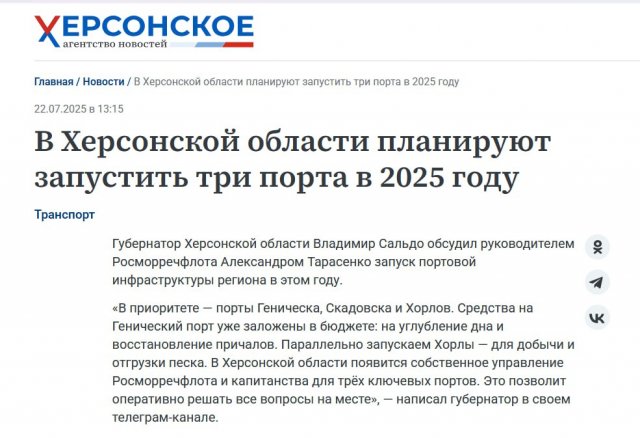 “У пріоритеті — порти Генічеська, Скадовська та Хорлів. Кошти на Генічний порт вже закладено у бюджеті: на поглиблення дна та відновлення причалів. Паралельно запускаємо Хорли – для видобутку та відвантаження піску. У Херсонській області з’явиться власне управління Росморрічфлоту та капітанства для трьох ключових портів. Це дозволить оперативно вирішувати усі питання на місці”, – повідомляють росіяни.