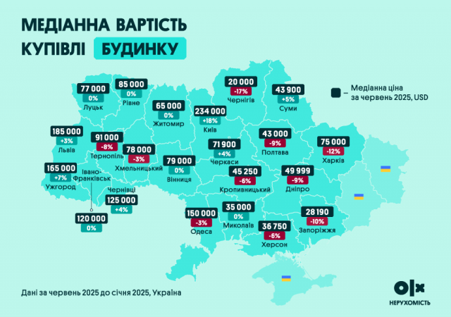 Інтерес до купівлі приватних будинків зріс на 19%, що пов’язано з викликами воєнного часу: прагненням покупців до автономності та віддаленості від великих міст. Медіанна ціна за пів року зросла на 12%. Найдорожчі міста для купівлі будинку — Київ (234 000 дол. США), Львів (185 000), Ужгород (165 000).