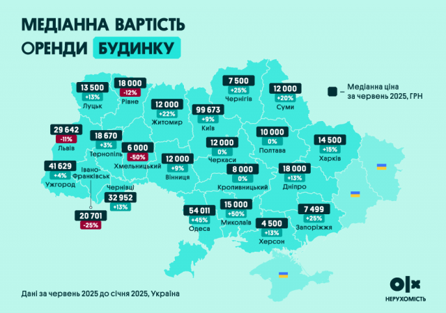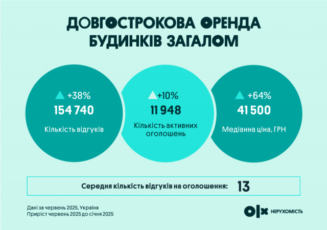 Сегмент оренди будинків також став активнішим: кількість відгуків збільшилась на 38%, пропозицій — на 10%, а медіанна ціна зросла на 64%. Найбільше подорожчала оренда в Миколаєві (+50%) та Одесі (+45%), тоді як у Хмельницькому ціни впали на 50%, а в Івано-Франківську — на 25%.