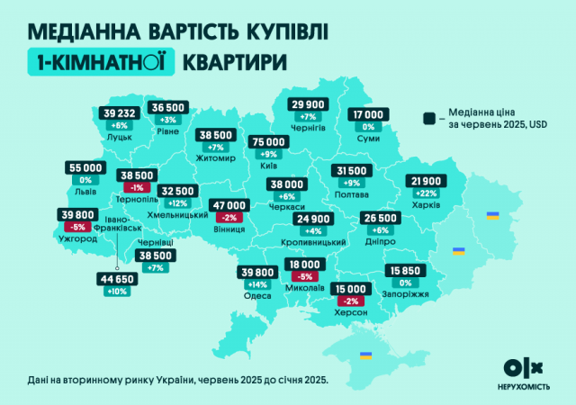 Водночас деякі міста продемонстрували незначне зниження: Миколаїв (-5%), Ужгород (-5%), Вінниця (-2%), Тернопіль (-1%). У Києві та Львові ціни залишаються найвищими.