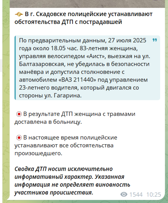Через відсутність незалежного доступу українських правоохоронців до тимчасово окупованої території, об’єктивну оцінку ДТП наразі надати неможливо. Такі інциденти вкотре засвідчують небезпеку життя цивільного населення під окупацією, зокрема в умовах погіршеної інфраструктури та слабкого контролю за дорожнім рухом. Варто також зауважити, що росіяни у повідомленні прямо кажуть про провину старшої жінки, яка начебто «не впевнилась» і «допустила» ДТП, хоча далі пишуть, що лише інформують і не надають оцінки, хто винен.