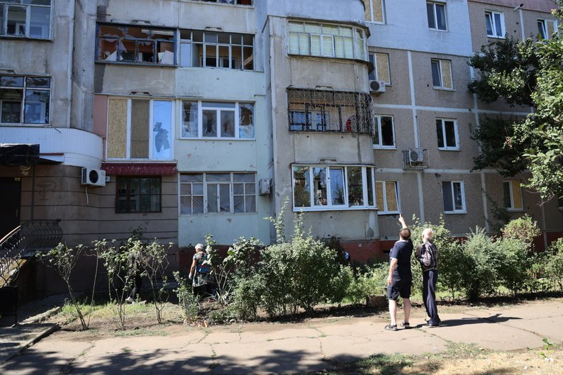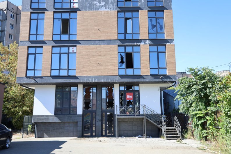 Жителі Центрального району Херсона продовжують долати наслідки обстрілу російських військових 24 серпня. Пошкоджені три багатоповерхівки, магазин, автівки, зупинка громадського транспорту. Одна людина отримала поранення. У неї діагностували черепно-мозкову травму та контузію.