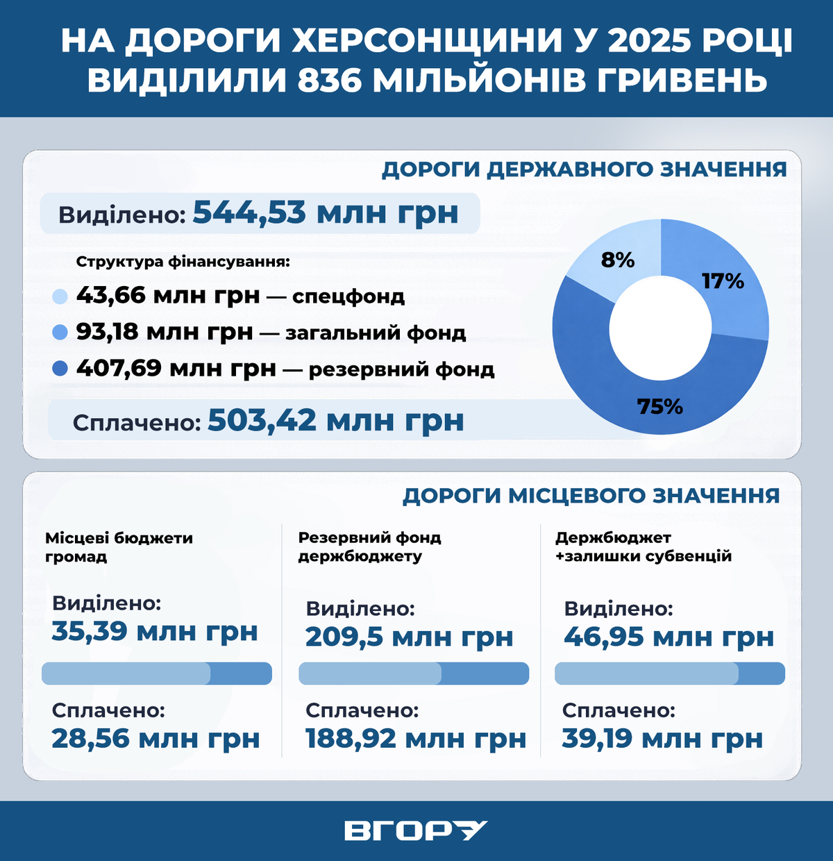 Водночас Державна установа «Місцеві дороги Херсонщини» повідомила «Вгору», що у 2025 році на експлуатаційне утримання автомобільних доріг загального користування місцевого значення, а також на поточний ремонт вулиць і доріг комунальної власності з місцевих бюджетів громад області виділили 35 мільйонів 385 тисяч 811 гривень. Підрядникам уже сплатили 28 мільйонів 559 тисяч 958 гривень 60 копійок.