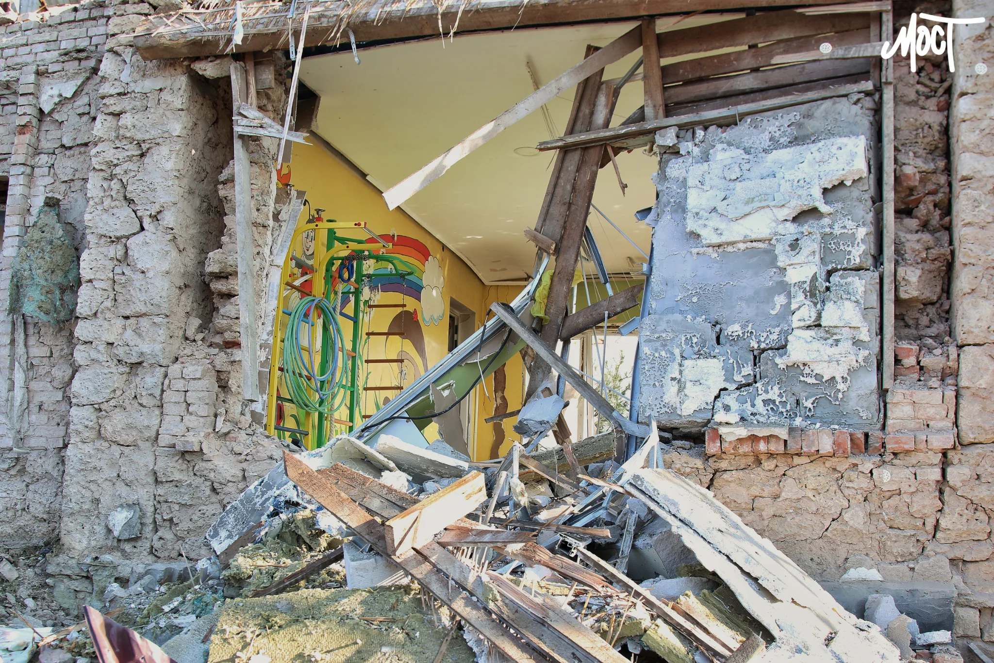 Залишки ракети, якою був атакований дитячий садок в селищі Зимівник Херсонської громади, й досі лежать поряд зі зруйнованою будівлею. На них можна побачити написи російською мовою.