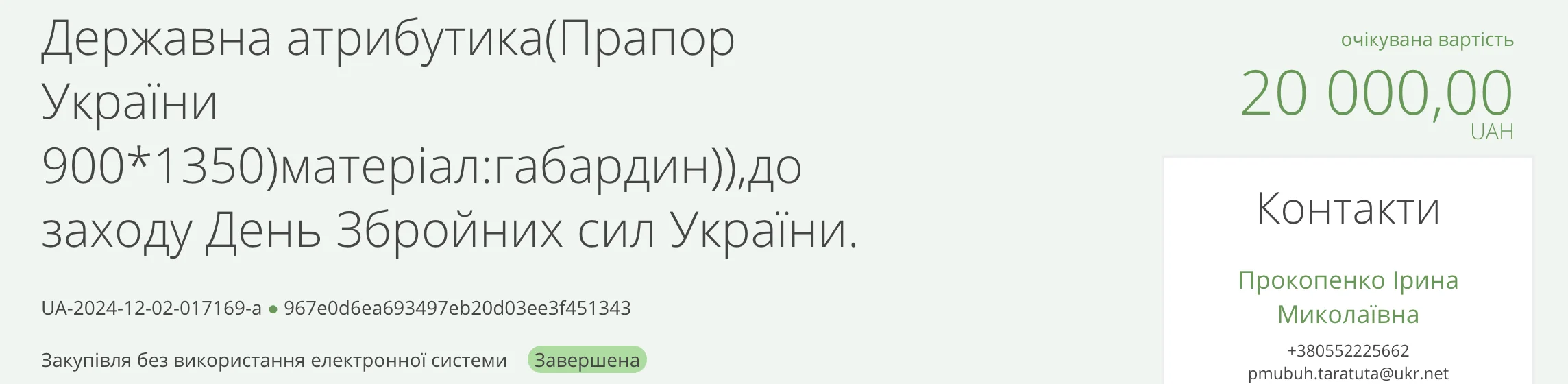 2 грудня управління культури ХМР замовило у підприємиці з Білозерки Тетяни Мантрової 80 прапорів вартістю 250 гривень за штуку на 20 тисяч гривень та 20 примірників книги “20 речей з Херсона” на 10 тисяч гривень. А у підприємця з Херсона Дмитра Міщанинця замовили 10 букетів на 5 тисяч гривень.