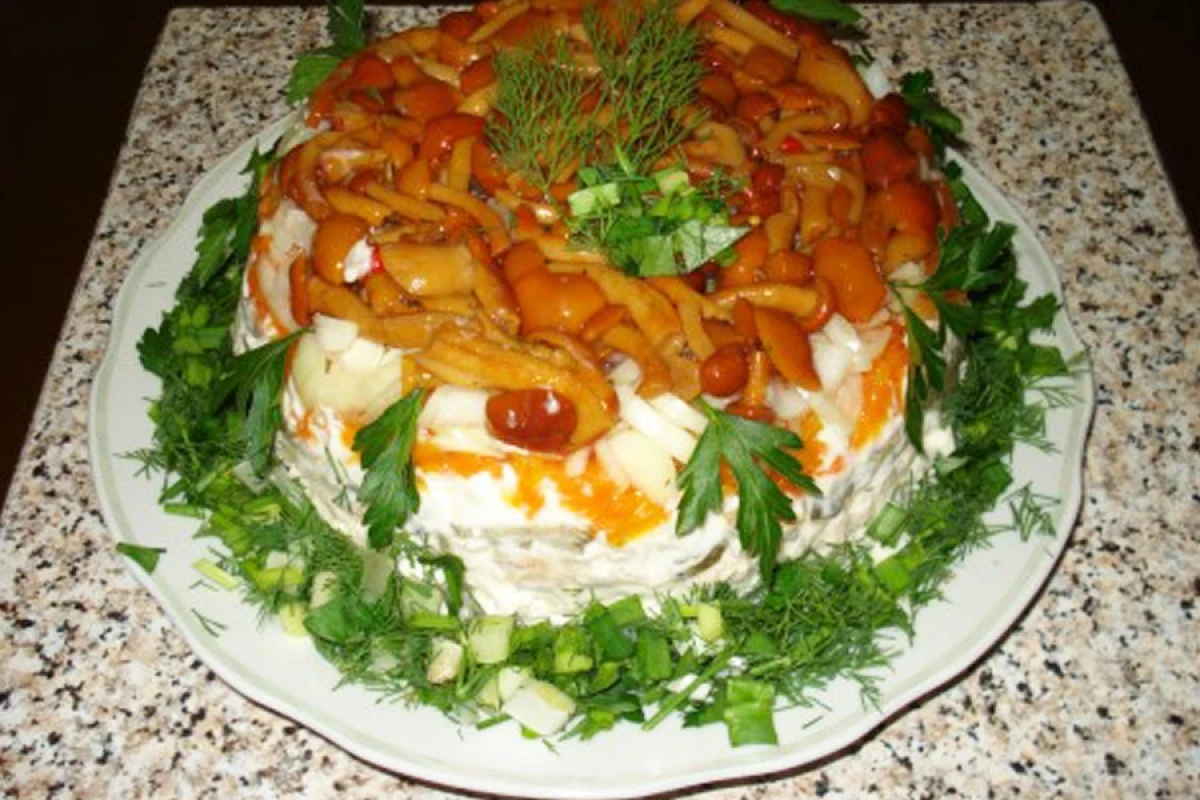 Берем глубокую миску и укладываем салат слоями. 1 слой – маринованные грибы. 2 слой – зеленый лук. 3 слой – нарезанная кубиками ветчина. 4 слой – нарезанный кубиками картофель. 5 слой – мелко порубленные вареные яйца. Все слои промазываем майонезом. Затем ставим салат в холодильник и перед подачей переворачиваем в другую тарелку.