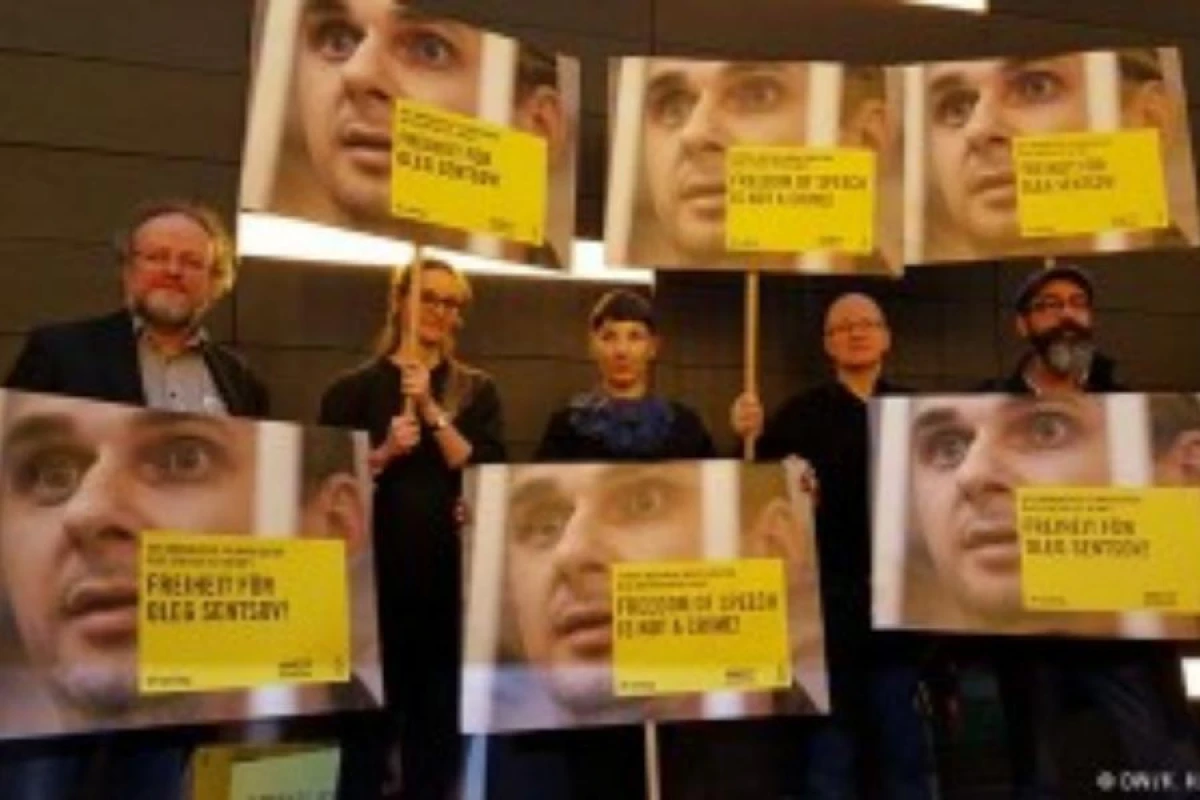 Участники акции вышли с портретами Сенцова на сцену. флешмоб организовала правозащитная организация Amnesty International при поддержке Немецкой и Европейской киноакадемий. Акцию поддержали актрисы Катя Риман и Мерет Бекер.