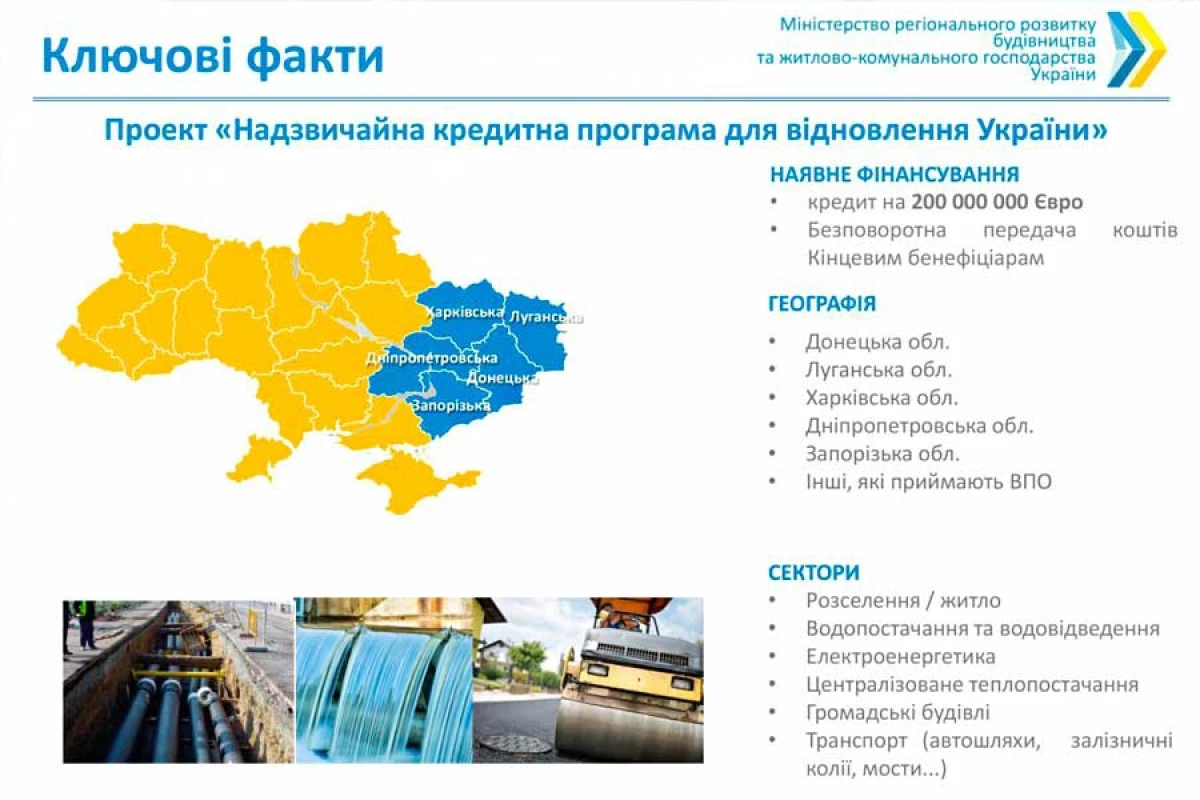 Міністерством регіонального розвитку, будівництва та житлово-комунального господарства України разом з органами місцевого самоврядування п’яти областей розроблено та затверджено Кабінетом Міністрів України 72 проекти на загальну суму 707 млн гривень для їх подальшої реалізації в рамках Надзвичайної кредитної програми для відновлення України.