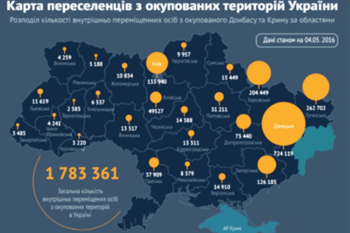 Станом на початок травня в Україні було зареєстровано 1,783 млн тимчасово переміщених осіб – людей, які виїхали з Криму і окупованих частин Донецької і Луганської областей. Такі дані наводить Міністерство соціальної політики України.
