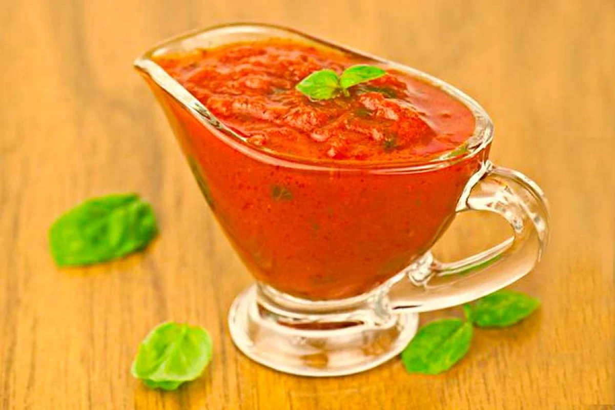 Снимаем кожицу с томатов, предварительно обдав их кипятком. Нарезаем их и даем немного постоять. Когда из помидоров выделится сок, нужно будет его слить. После этого ставим томаты тушиться до тех пор, пока они немного не загустеют. Затем добавляем измельченный чеснок и нарезанный острый перец. Мелко нарезаем зелень и добавляем ее к томатам вместе с солью и специями. Провариваем соус еще несколько минут и выключаем. Даем ему настояться под крышкой минут 30.