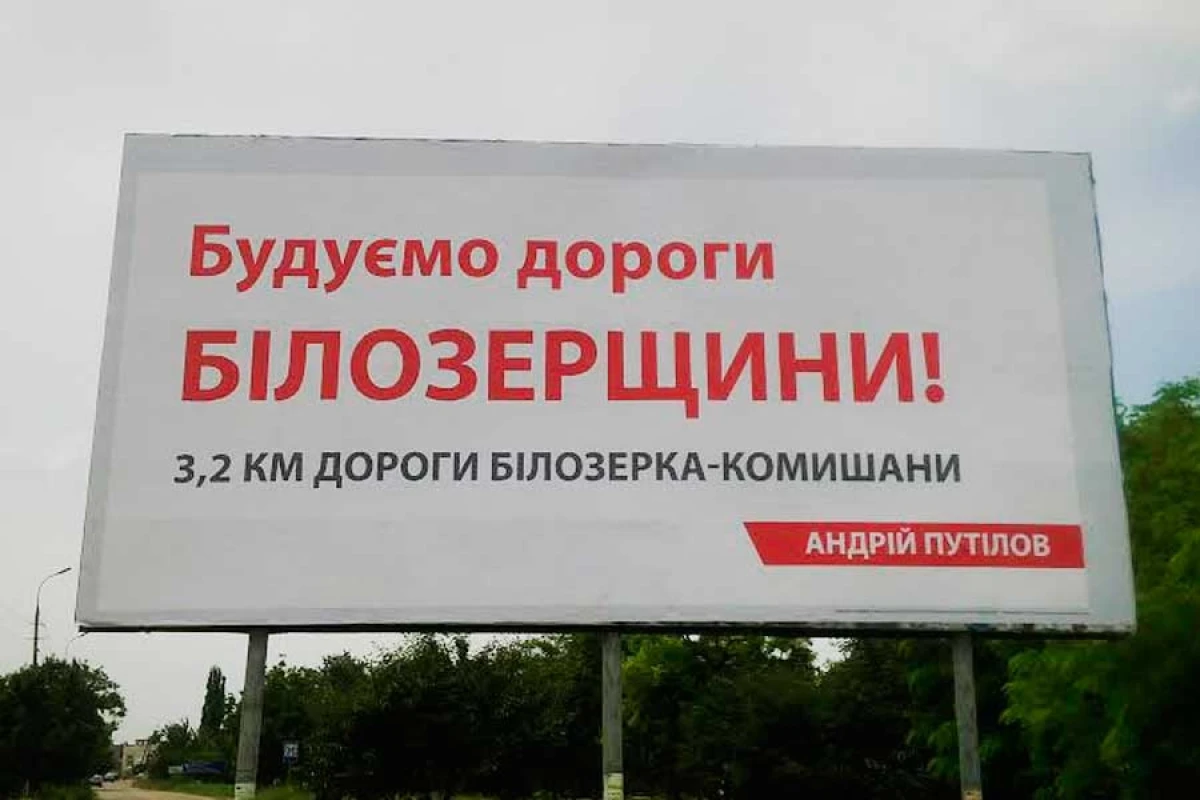 По дорозі з м. Херсона до смт Бліозерка, що входить до 183-го виборчого округу, днями з’явились два білборди, на яких напис: «Будуємо дороги Білозерщини. 3,2 км дороги Білозерка – Комишани. Андрій Путілов», в вихідних даних вказано, що замовник - кандидат в народні депутати Путілов А.С., наклад – 2 примірники. (фото 1,2) Наші спостерігачі зробили відео ремонту вказаної на білборді дороги.