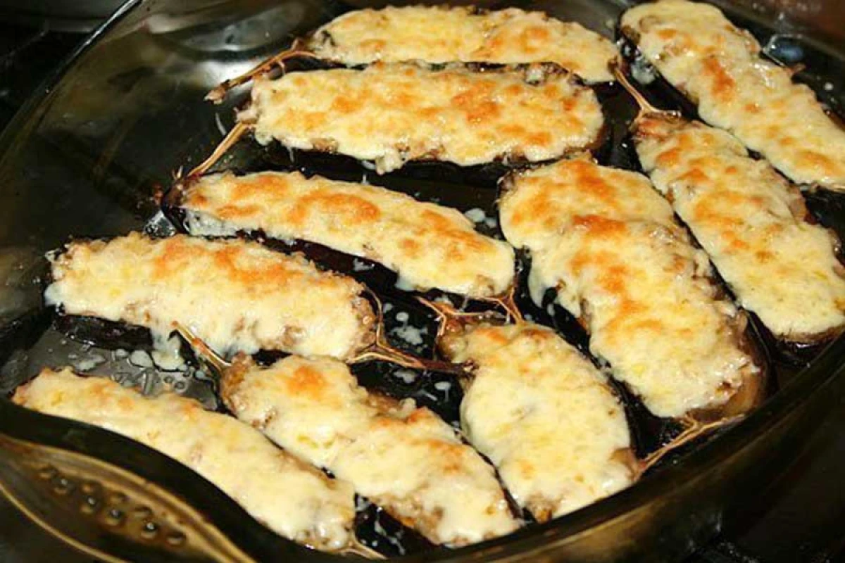 Достаем баклажаны и с помощью чайной ложки удаляем из них мякоть. Измельчаем ее и добавляем на сковороду к луку и шампиньонам. Обжариваем пару минут. Добавляем в смесь сметану. Перемешиваем начинку и фаршируем ею баклажанные лодочки. Натираем твердый сыр и посыпаем им блюдо.