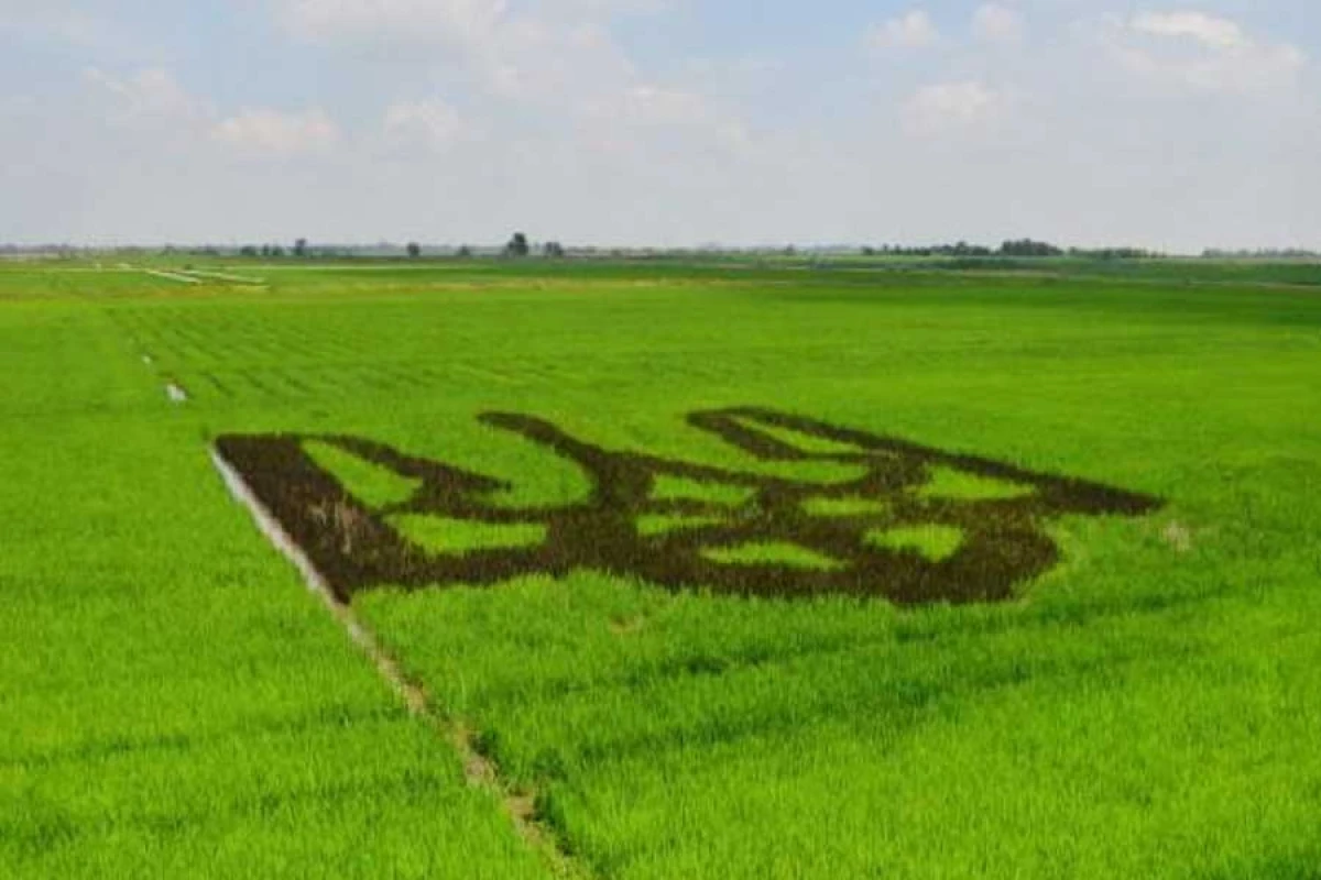 Аграрії серед поля висіяли чорним рисом зображення велетенського тризуба, яке можна побачити навіть із космосу. За попередніми даними, площа рекордного зображення становить майже 400 кв.м. Автори проекту – співробітники відділу селекції Інституту рису НААН України під керівництвом завідувача, кандидата сільськогосподарських наук Дмитра Шпака.