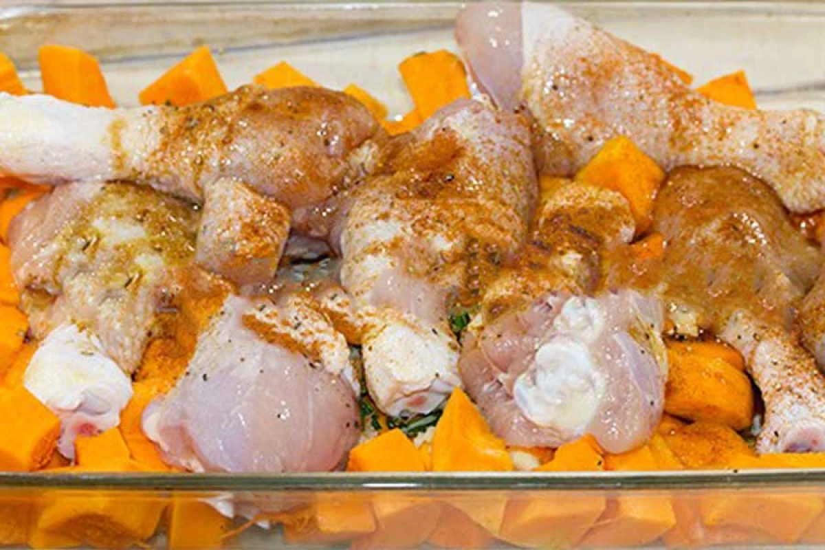 В сковороде обжариваем курицу с двух сторон до золотистого цвета. Выкладываем обжаренные куриные ноги в форму, сюда же отправляем тыкву. Нарезаем яблоко кусочками. Кладем пару веточек тимьяна, возвращаем форму в духовку и доводим до готовности 20-25 минут. Посыпаем свежей зеленью.