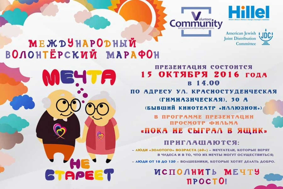 15-го октября в 14:00 пройдет международный волонтерский марафон “Мечта не стареет”. Приглашаются люди "золотого" возраста (60+) - мечтатели, которые верят в чудеса и в то, что их мечты могут осуществиться.