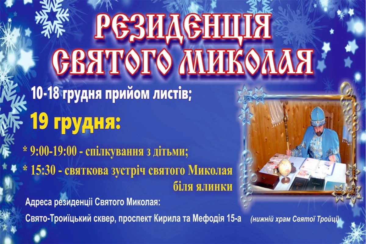 З 10 грудня і по 18 грудня Святий Миколай приймає листи від дітей. В святковий день 19 грудня з 9-тої години ранку і до 19:00 години ми зможете завітати у гості до святого Миколая, чи записатися до нього «на прийом». А вже в 15:30 разом з усіма будемо зустрічати приїзд святого Миколая із українських Карпат!