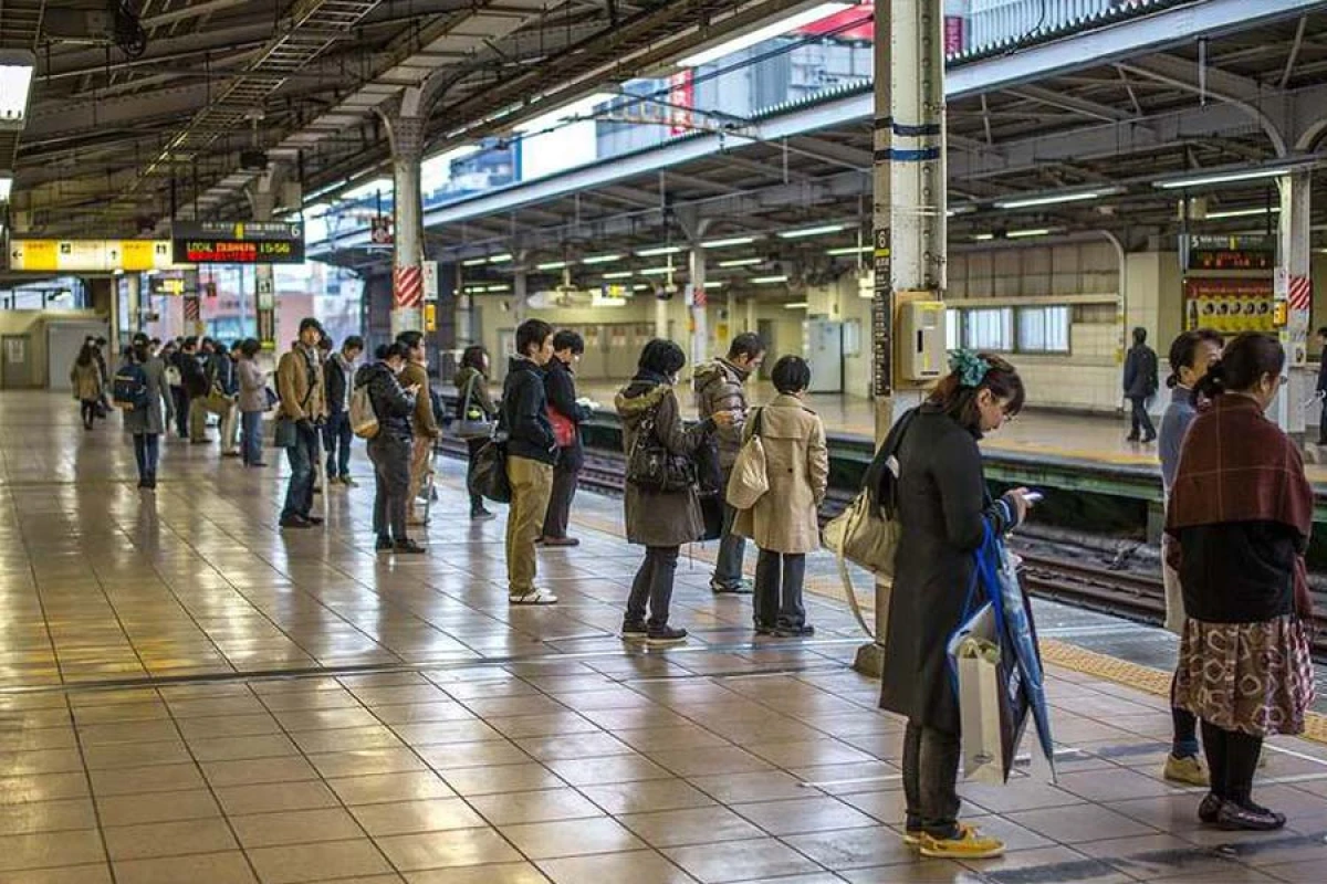 Так японцы ждут поезд в метро. На платформе нанесены специальные линии, обозначающие, где будут двери у состава. Очередь идеально ровная. Никто даже не думает жульничать.