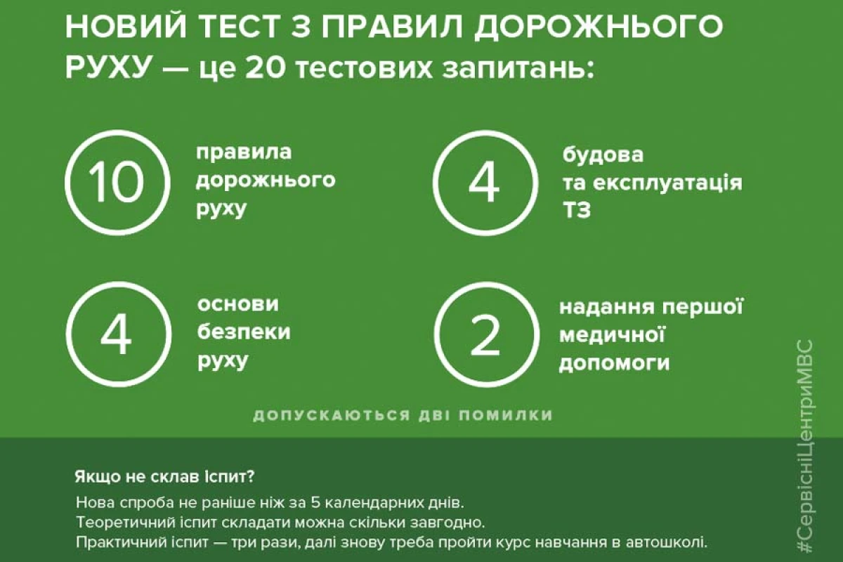Інших змін теоретична частина іспиту не зазнала: тест триватиме 20 хвилин і складається з 20 питань, що обираються системою рандомно (випадково). Тож, завчити екзаменаційний білет тепер не вийде. Тест обов’язково містить питання за 4 тематичними категоріями: 10 питань із правил дорожнього руху, 4 питання з будови та експлуатації транспортних засобів, 4 питання з основ безпеки руху та 2 питання з надання першої медичної допомоги.