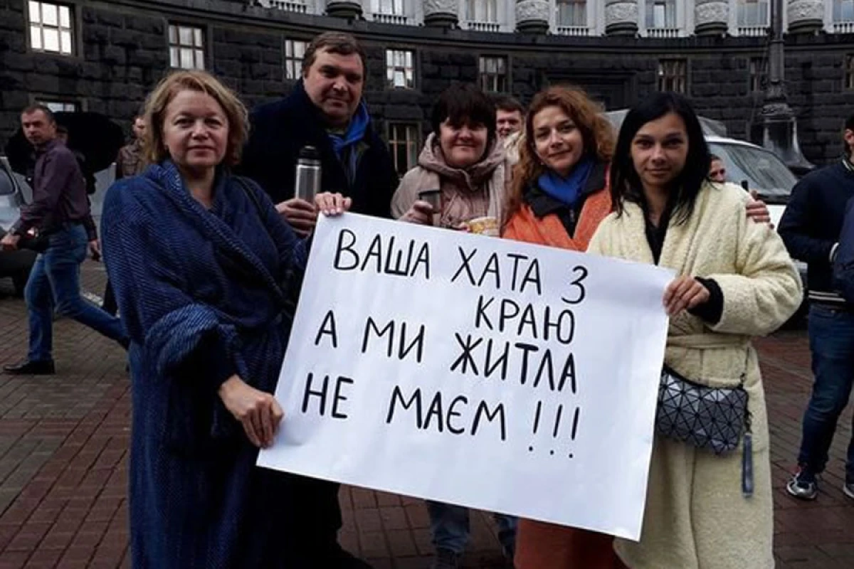 Переселенці в домашніх халатах і тапочках влаштували флешмоб на підтримку Закону №1954 під будівлею Кабміну.