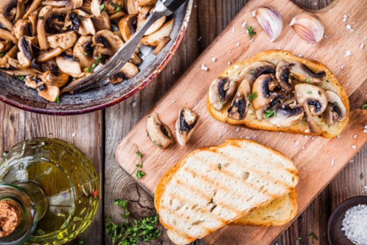 Скибочки багета помастити оливковою олією і підсушити в духовці 10 хвилин. Потерти часником. Гриби нарізати пластинками і обсмажити на вершковому маслі.