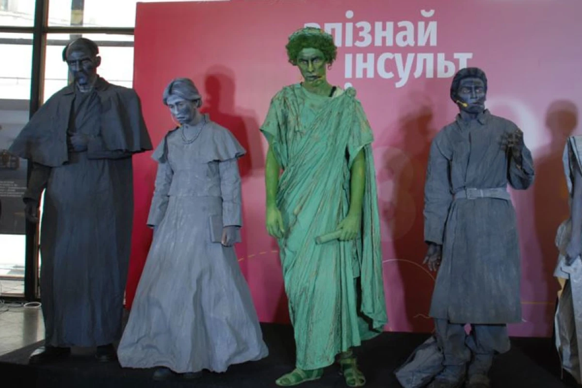 Сьогодні кияни на станції метро "Золоті Ворота" взяли участь в освітній креативній постановці. Вони стали акторами в образах пам'ятників Тарасові Шевченку, Лесі Українці, Григорію Сковороді і навчали розпізнавати перші ознаки інсульту.