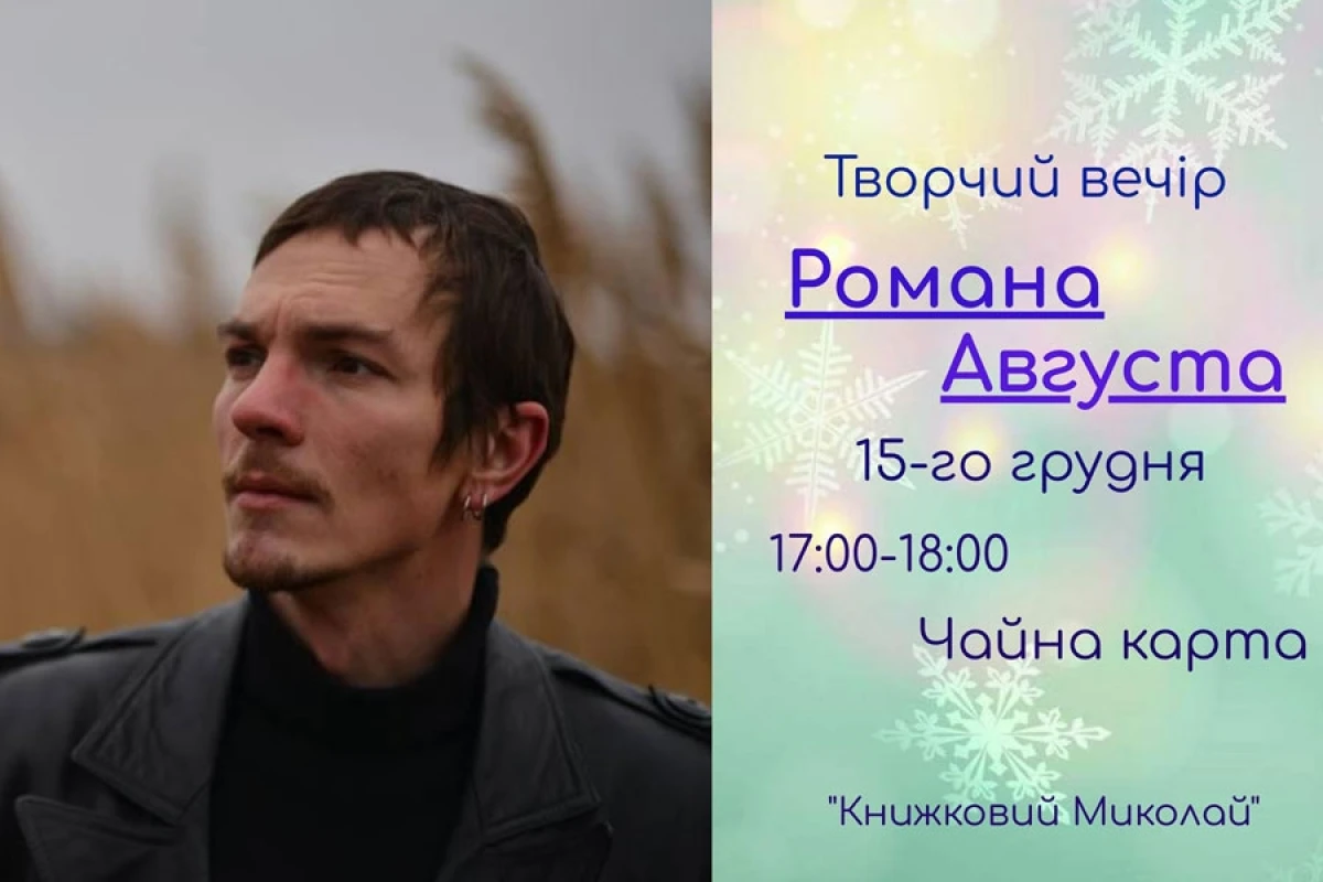 15-го грудня у магазині-кафе "Чайна карта" відбудеться творчий вечір херсонського поета та музиканта Романа Августа. Захід пройде у рамках ІІІ-го Південного фестивалю книги та читання "Книжковий Миколай".