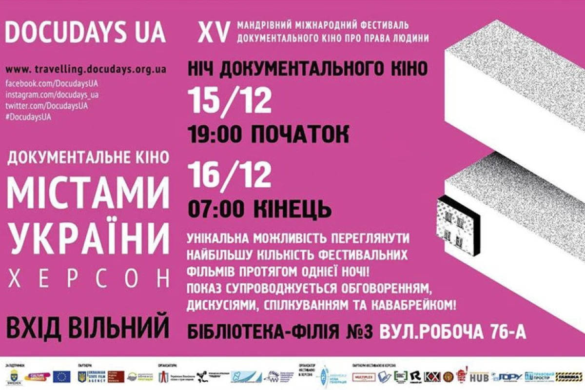 У суботу, 15 грудня, відбудеться Ніч документального кіно на базі Херсонської ЦБС Бібліотеки-філії №3 в рамках Мандрівний фестиваль Docudays UA на Херсонщині. Всі, хто не мав можливості потрапити на відкриті покази та на спецпокази, зможуть подивитись більшу частину фільмів з програми фестивалю.