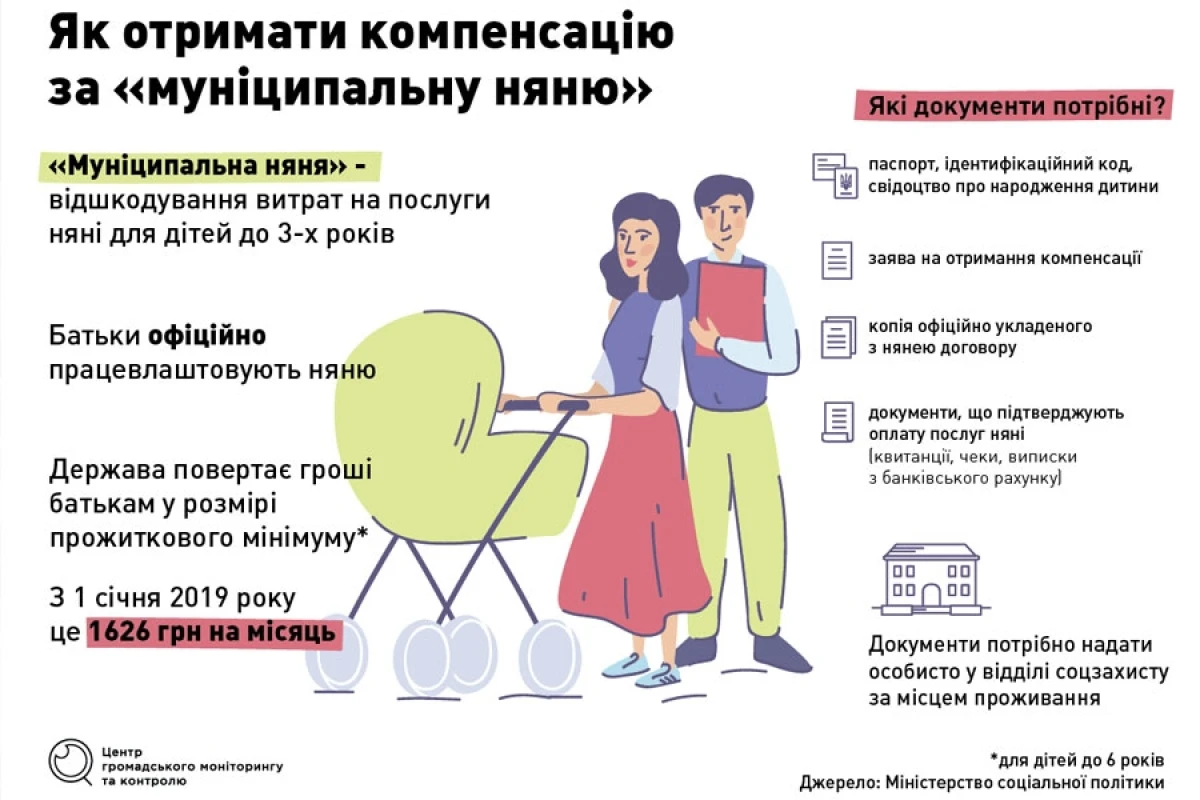 Скільки відшкодує держава? «Муніципальна няня» – це урядовий проект з підтримки молодих батьків, який запрацював з 1 січня 2019 року. У його рамках держава компенсувє частину витрат на послуги няні для дітей до 3-х років. Сума відшкодування рівна розміру прожиткового мінімуму для дітей до 6 років, станом на сьогодні це 1626 гривень на місяць. У Міністерстві соцполітики наголошують, що компенсація на няню не заміняє інші соціальні виплати на дитину і виплачується окремо за бажанням батьків.