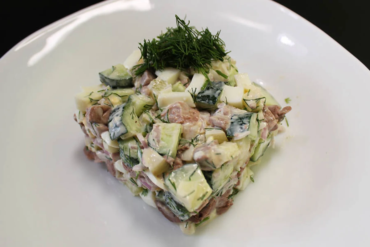 4. Змішайте всі інгредієнти в глибокій мисці крім печінки, трохи кропу залиште для прикраси. Салат посоліть, заправте майонезом і перемішайте. В кінці додайте печінку і знову акуратно перемішайте.