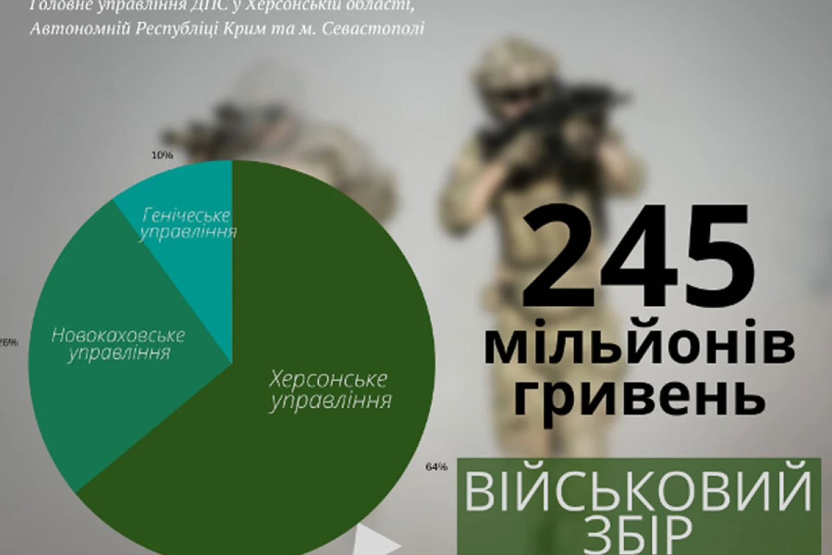 Більшу половину або 64 відс. від загальних надходжень по області сплатили платники Херсонського управління Головного управління ДПС у Херсонській області, Автономній Республіці Крим та м. Севастополі, які и 158,3 млн. грн. військового збору.