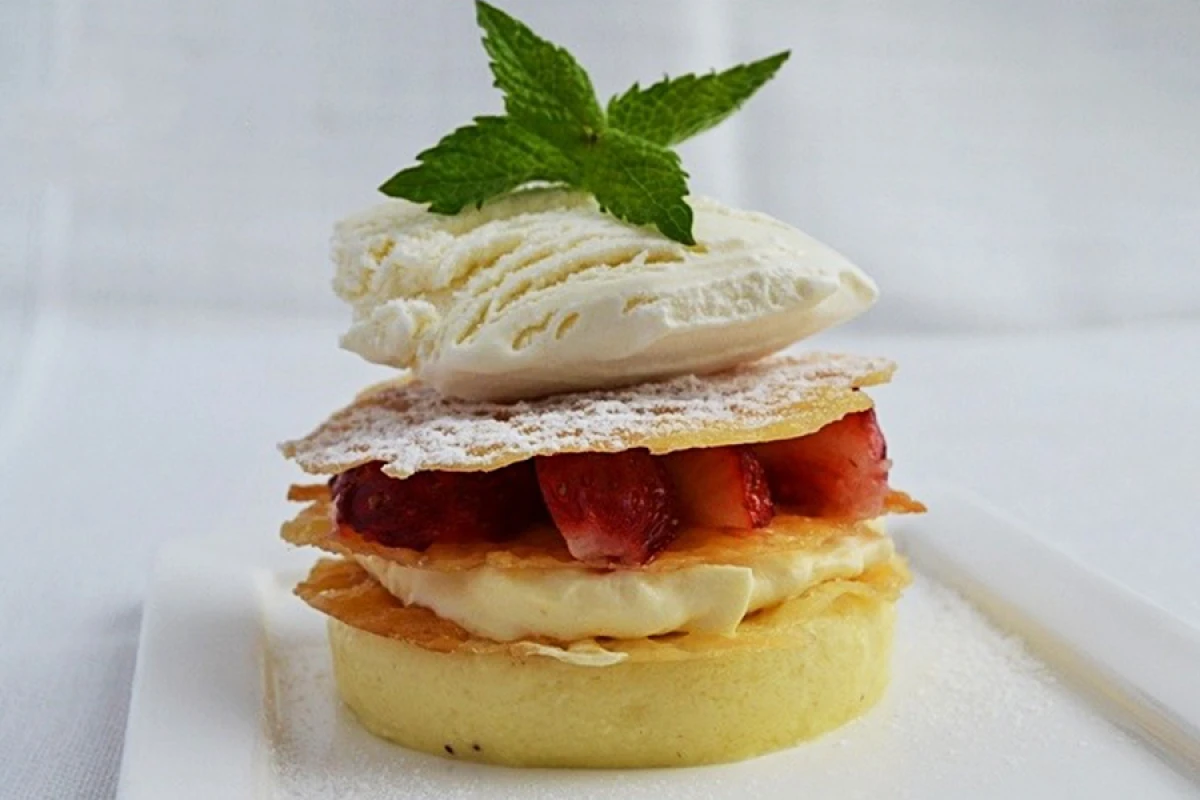 4. Охолодити і поставити в холодильник. Круглою металевою формою вирізати кружальця. На тарілку викласти кружечок крем-брюле, зверху хрусткий кружок.