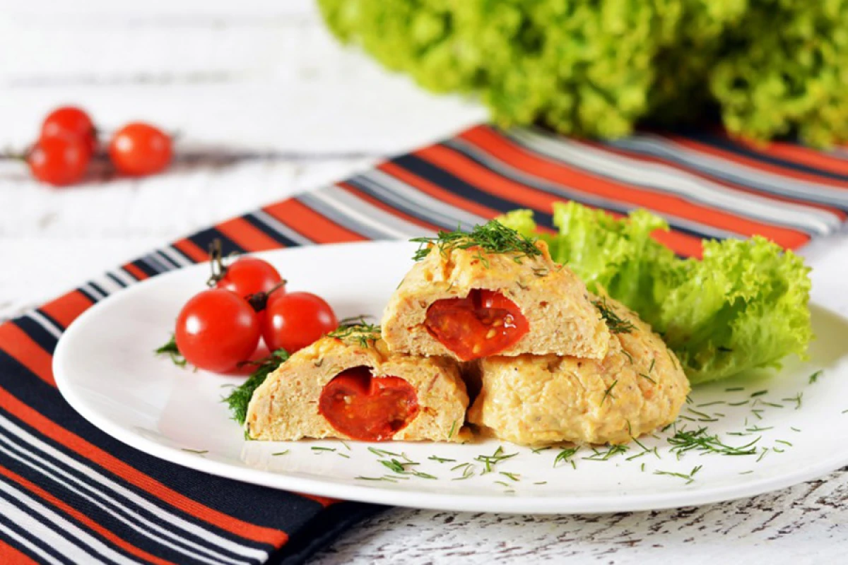 Відправити масу у холодильник на 30 хвилин. Деко змастити олією. Мокрими руками сформувати котлети, вставляючи у кожну один помідор-черрі.