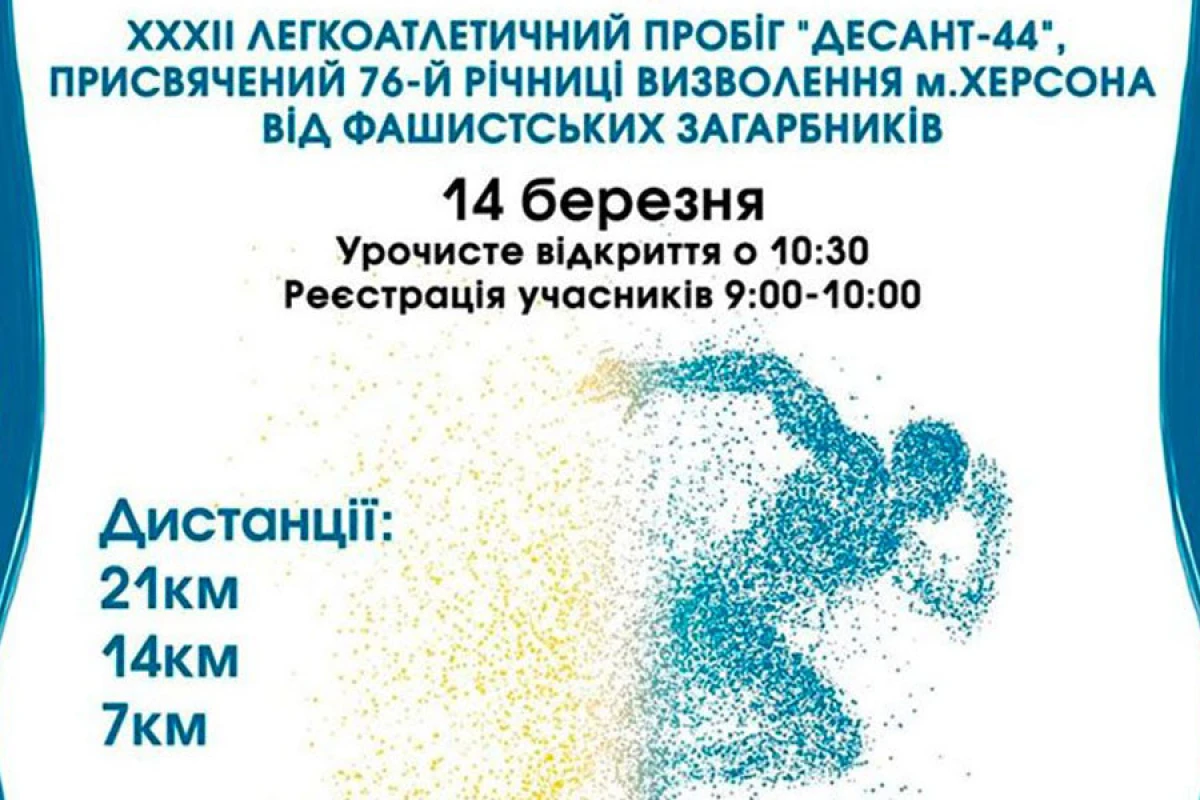 ХХХII легкоатлетичний пробіг «Десант-44» відбудеться 14 березня. Маршрут дистанції 21 км буде проходити від кінотеатру “Салют” в Антонівку. Далі, після розвороту навколо пам’ятника визволителям Херсона, учасники по Кіндійського шосе і вулиці Перекопської прибіжать на фініш до Херсонського вищого училища фізичної культури. Дистанція 14 км буде починатися біля пам’ятника визволителям Херсона, а 7 км – біля «Салюта». Реєстрація буде проводитися в зоні фінішу біля Херсонського вищого училища фізичної культури з 9.00 до 10.00. О 10.30 відбудеться урочисте відкриття забігу, а вже о 11.00 транспорт забере учасників в зони старту. Перші нагородження переможців очікуються до 13.00.