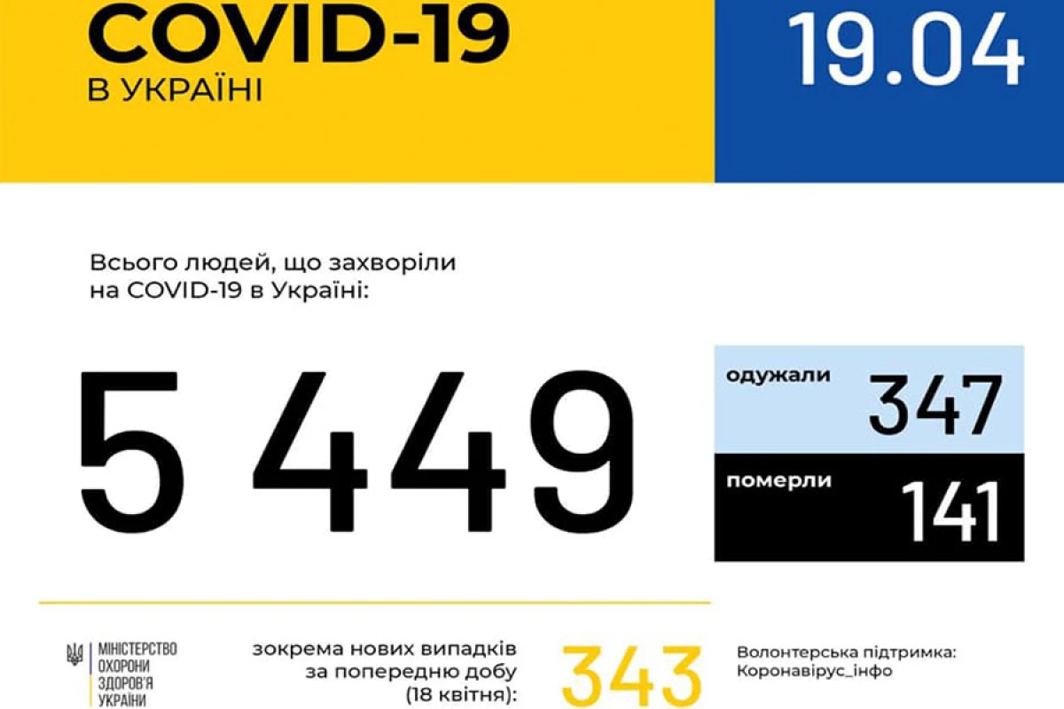 За даними ЦГЗ, станом на 9:00 19 квітня в Україні 5449 лабораторно підтверджених випадків COVID-19, з них 141 летальний, 347 пацієнтів одужали. За добу зафіксовано 343 нові випадки.