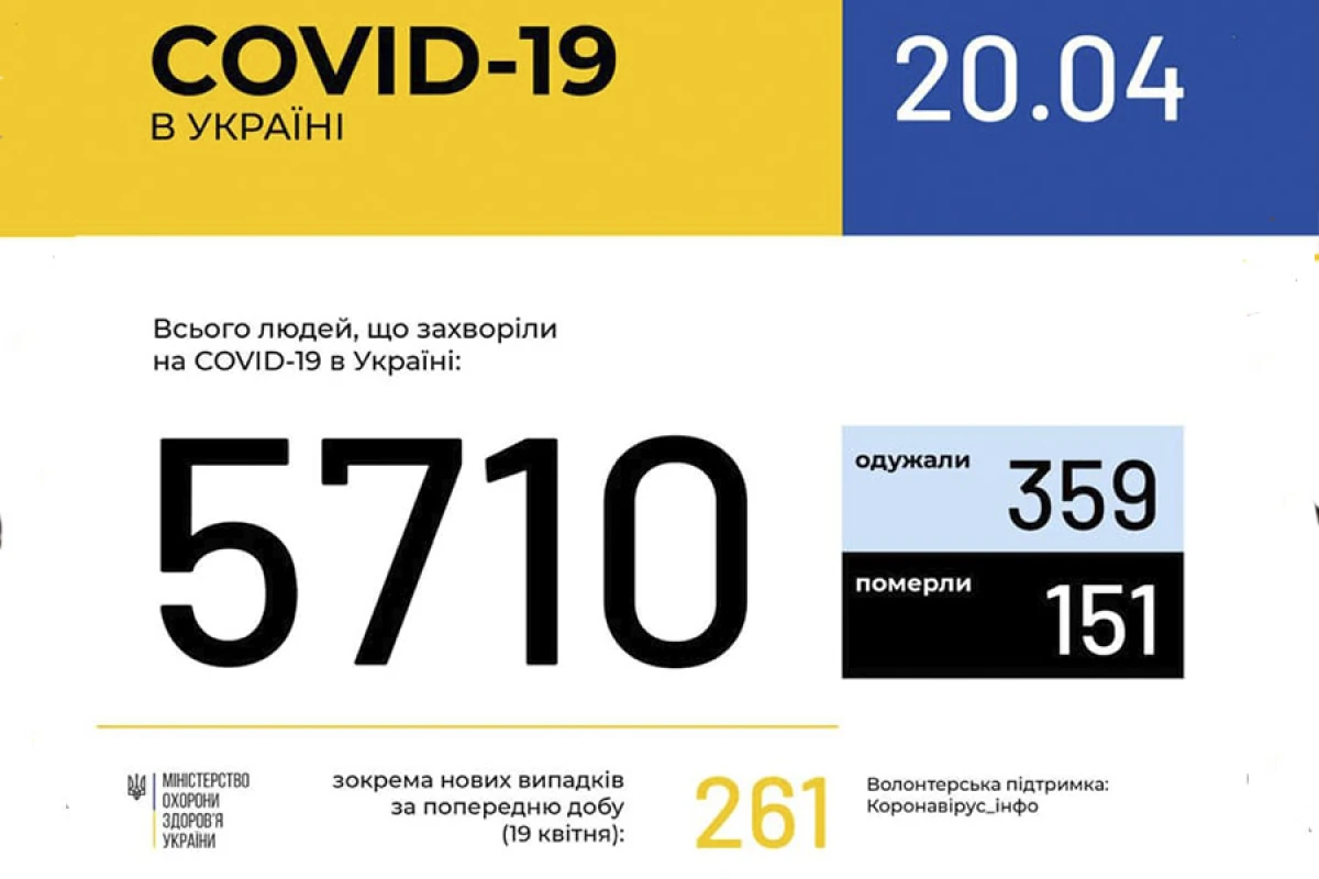За даними Центру громадського здоров’я України, станом на 9:00 20 квітня в Україні 5710 лабораторно підтверджених випадків COVID-19, з них 151 летальний, 359 пацієнтів одужали.
