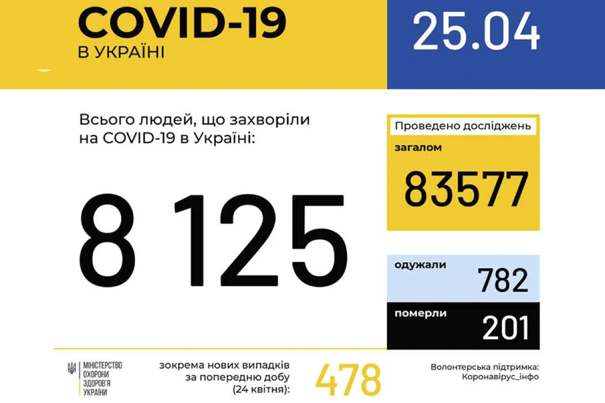 За даними Центру громадського здоров’я України, станом на 9:00 25 квітня в Україні 8125 лабораторно підтверджених випадків COVID-19, з них 201 летальний, 782 пацієнти одужали.